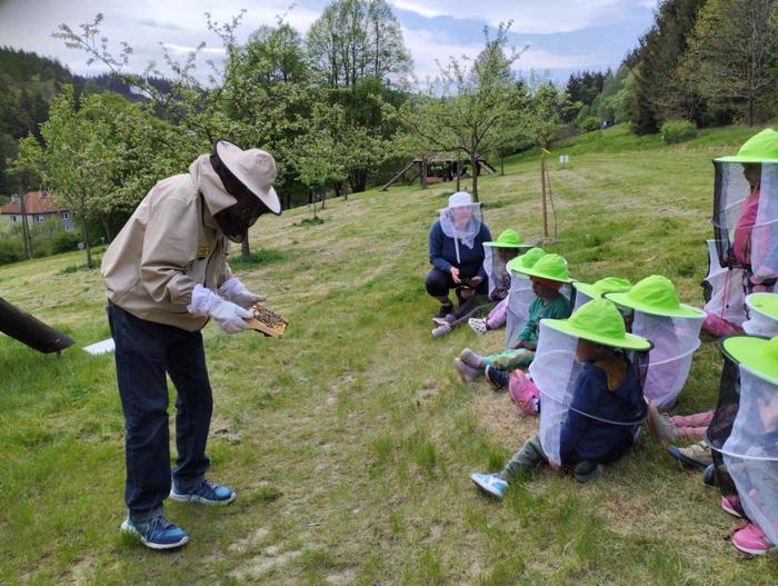 Po vzájemném přivítaní a představení paní učitelek, byly děti rozděleny do třech skupin podle věku. Na prvním stanovišti – Včelín se děti dozvěděly spoustu zajímavých informací o životě včel, práci včelaře a jeho pomůcek k práci. Děti velmi zaujala názorná ukázka včel a poutavý výklad pana včelaře. Na druhém stanovišti si děti vyzkoušely chytání hmyzu do síťky a pozorování pod lupou. Na třetím stanovišti děti pozorovaly lupou mravence a ruměnici pospolnou. Poté si vybraly obrázek hmyzu a jejím úkolem bylo pomocí přírodnin poskládat obrys těla. Děti odjížděly domů plné nových dojmů a informací.