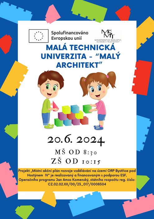 Dne 20. 6. 2024 nás navštívila Malá technická univerzita. Tato aktivita proběhla v rámci projektu MAP IV. Děti se seznámily s prací architekta. Projekt byl určen pro děti z mateřské školy a žáky 1. a 2. třídy základní školy.