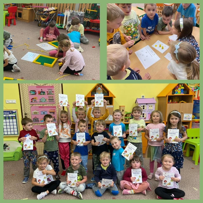 Také se naučily stavební říkanku s pohybem, která jim pomohla lépe pochopit, jak se staví dům. Na konci děti jako odměnu za svou snahu i plné nasazení při stavbách domů dostaly diplom „Malý architekt“ .
