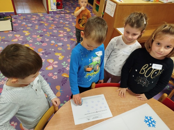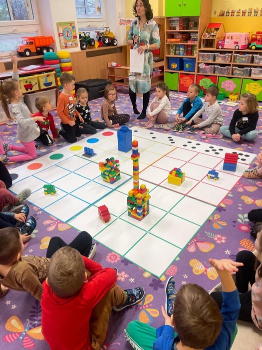 Jako první děti přiřazovaly dvojice obrázků - ,,Robotizace ve společnosti“ (minulost/ současnost). Poté sestavovaly druhé poloviny sněhuláků - děti si procvičily: velikost, tvar, barvu, počet. Následovalo dětem méně známé ,,sudoku", kde na čtvercové síti děti přiřazovaly obrázky a puntíky. Potom přišla na řadu konstruktivní hra s lego duplem - děti sestavovaly domek, most, maják, auto. Nakonec si děti zahrály ,,na robota“ - tato hra se dětem velmi líbila, poznali, jak pracuje programátor a robot, procvičily si orientaci, počet, barvy a základy programování. Děti obdržely na závěr diplomy, paní lektorka všechny pochválila, rozloučila se.
