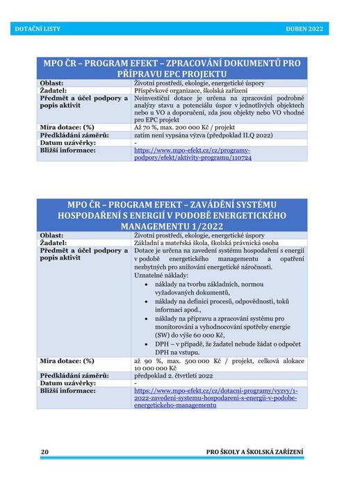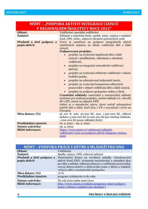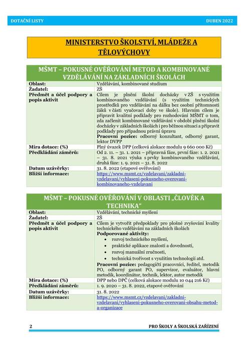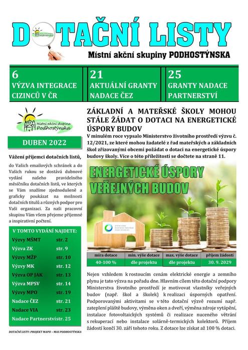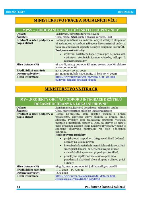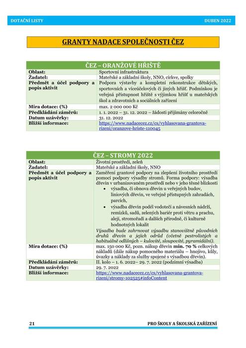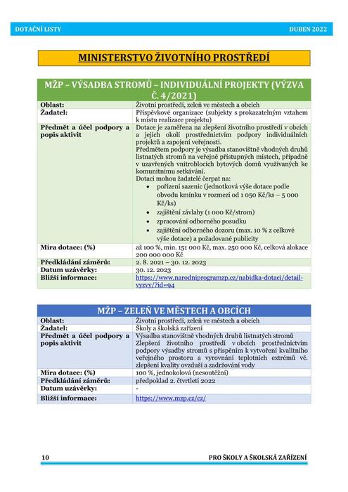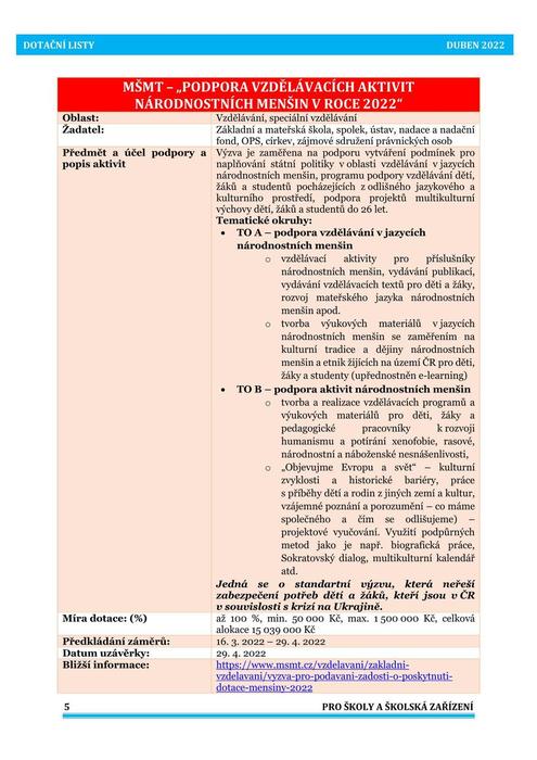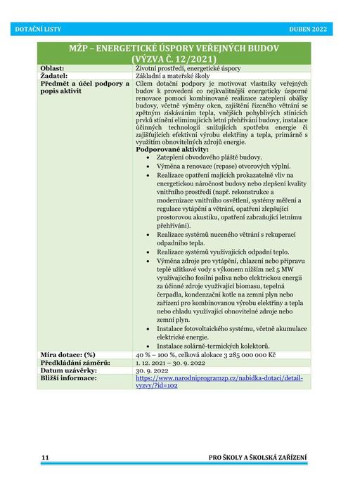 V minulém roce vypsalo Ministerstvo životního prostředí výzvu č. 12/2021, ze které mohou žadatelé z řad mateřských a základních škol zřizovanými obcemi požádat o dotaci na energetické úspory budovy školy. Více najdete v dubnových Dotačních listech pro školy.