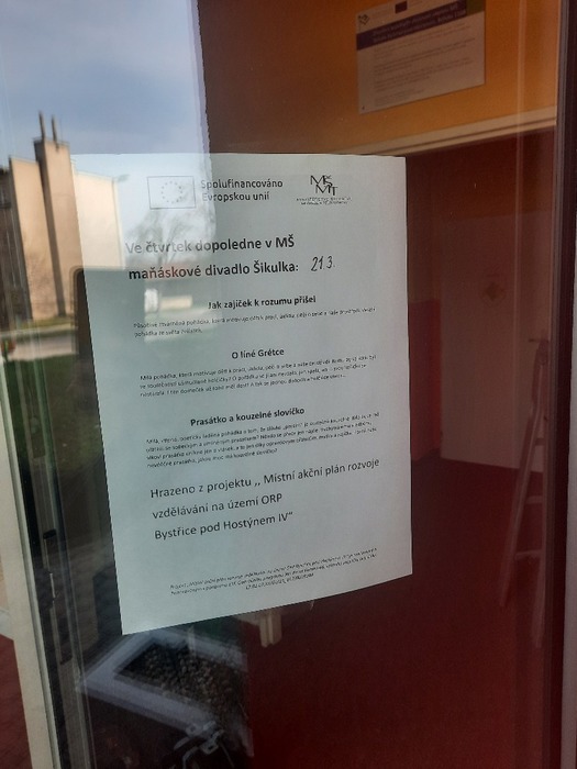 Ve čtvrtek 21. března ve školce MŠ Bělidla Bystřice pod Hostýnem děti přivítali divadlo s názvem Šikulka se svým představení, které bylo plné ponaučení. Divadlo se skládalo ze tří kratších pohádek: Jak zajíček k rozumu přišel, O líné Grétce, Prasátko a kouzelné slovíčko. Pohádkami prolínalo téma slušného chování, používání slůvek děkuji, prosím, aj. Děti tak měly možnost si připomenout, jak správně dodržovat a podporovat mezilidské vztahy.